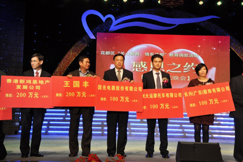 圖:花都區舉辦“關(guān)心教育,情系花都”教育捐款活動(dòng)中,國光捐贈100萬(wàn)元,以實(shí)際行動(dòng)回饋社會(huì )。左圖為黨委郝旭明書(shū)記捐贈儀式上