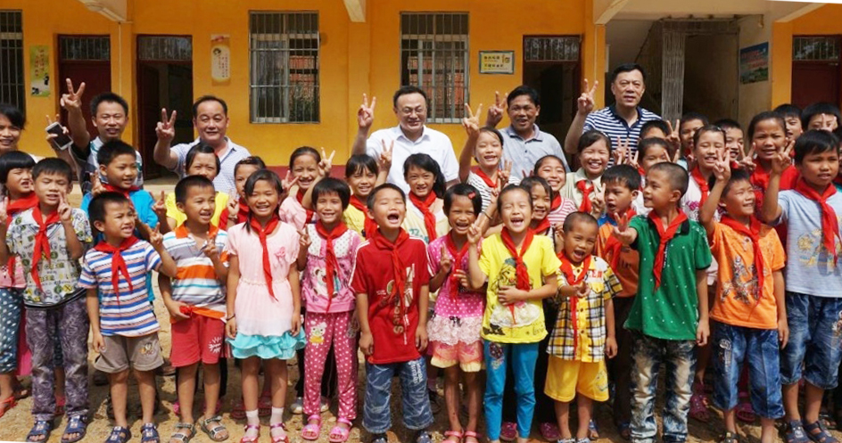 圖:2014年7月4日,黨委書(shū)記郝旭明,黨委委員、副總裁鄭崖民代表國光黨委到蓬沖小學(xué)探望慰問(wèn)學(xué)生,與師生合影留念