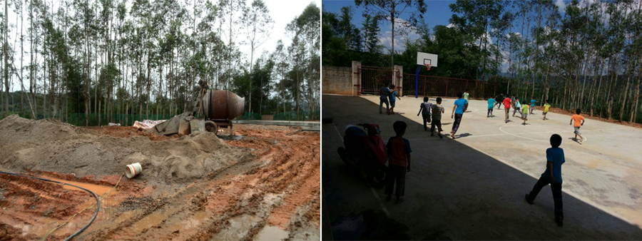 右圖:石澗分校的孩子們在已鋪設好的水泥地操場(chǎng)上快樂(lè )玩耍