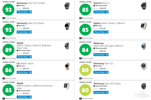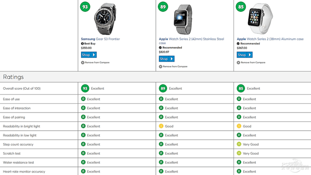 大家可以從上面的表格里看到這19款產(chǎn)品的前10款排名以及對應的得分,三星Gear S3的兩個(gè)版本分列前兩名,隨后是蘋(píng)果、LG、佳明等,而且有趣的是,前兩款三星Gear S3的價(jià)格(350美元,稅前)僅為第三名Apple Watch Series2(不銹鋼版)的一半(700美元,稅前),于是我們比較好奇該機構對這些產(chǎn)品的具體評分是怎樣的?