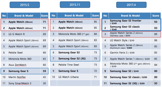 我們翻查了該機構近兩年智能手表類(lèi)別的排名數據,發(fā)現蘋(píng)果Apple Watch之前一直占據著(zhù)前兩名,從2015年開(kāi)始的Apple Watch一代,到去年發(fā)布最新的Apple Watch Series2上,由于系統升級和硬件換代的因素,其蘋(píng)果Apple Watch手表的評分一直在增加,從71分、85分到這次的89分,不斷在進(jìn)步,只是這次兩款三星Gear S3的得分均高達93分,所以說(shuō)這不能怪蘋(píng)果(三星:怪我咯?。?/span>