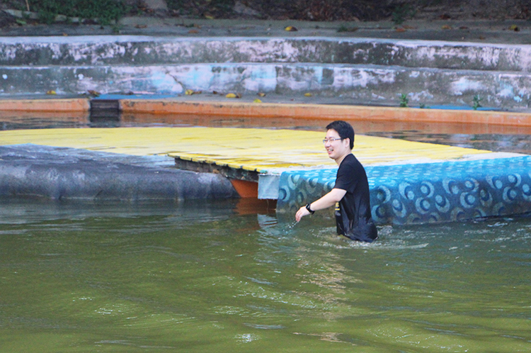 下午,我們需要參加的是緊張刺激的水上拓展訓練。其中一項活動(dòng)為“孤島求生”,隊員必須從岸邊的起點(diǎn),利用空中的長(cháng)繩擺蕩到水面上一個(gè)面積約1㎡的平臺上,全部成員順利登陸平臺再依次擺蕩回到岸邊起點(diǎn),平臺目前最高紀錄可同時(shí)站立26人。
